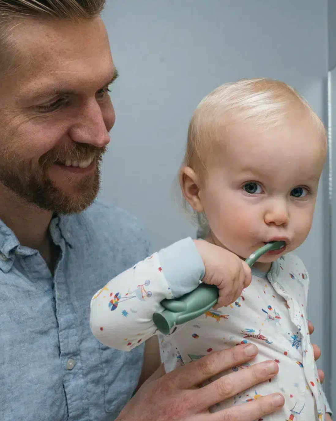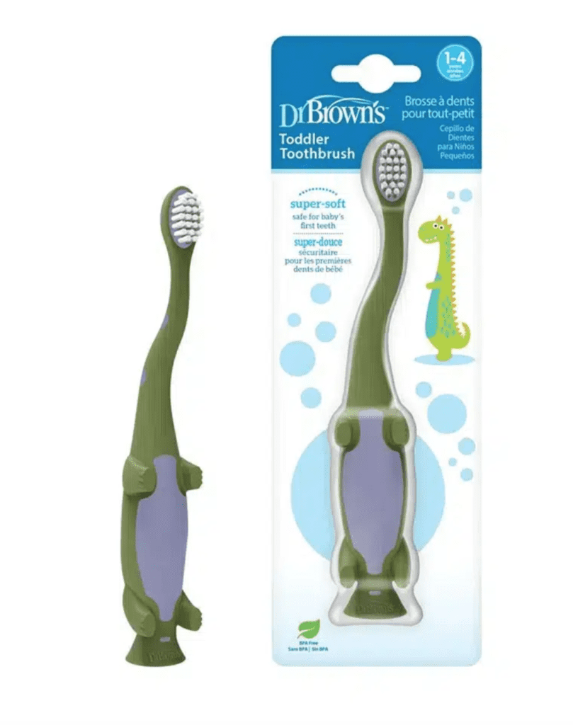La brosse à dents pour tout-petits Dinosaure Vert Dr Brown’s rend le brossage amusant et encourage les enfants à prendre soin de leurs dents dès leur plus jeune âge.