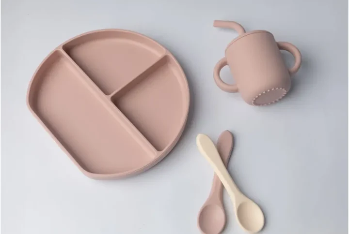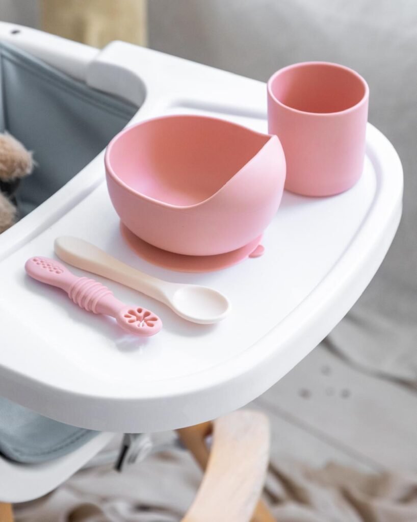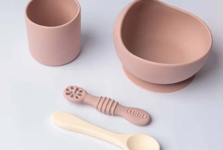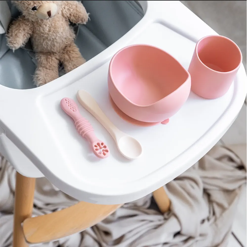 YUMMY Coffret Repas en Silicone – Bol, Verre et Deux Cuillères Rose Poudré – 4M+