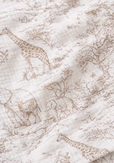 On aime particulièrement son motif style toile de Jouy, esprit jungle, finement dessiné dans un sable doux et lumineux.