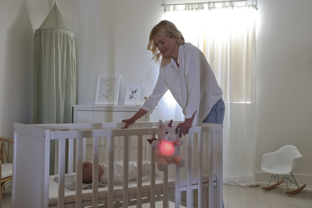 Les LoveLight™ offrent les éléments sonores, tactiles et visuels qui rassurent bébé. Aux 4 mélodies et 4 bruits blancs que jouent nos douces peluches musicales s’ajoute une fonction d’enregistrement pour que les parents puissent laisser un doux message ou chantonner la berceuse préférée de leur enfant. De plus, Lily la licorne s’illuminent d’une lueur chaleureuse qui pulse doucement pour apaiser les tout-petits, avec 5 couleurs et 2 effets lumineux. Pratique, grâce au détecteur de mouvement Shake&Play une simple secousse de la peluche permet de redémarrer la lumière, les berceuses et le message sonore enregistré par les parents. Les LoveLight™ peuvent aussi être accrochées au lit de bébé, tout comme un mobile de nuit. Le moniteur rechargeable (usb-c) et la peluche peuvent aussi être utilisés séparément : une veilleuse lumineuse nomade qui pourra être posée sur la commode de la chambre et le doudou qui accompagnera l’enfant. Elles sont également dotées d’une minuterie automatique de 30 min.