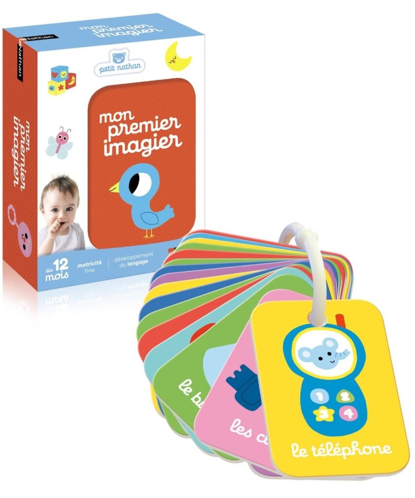 Un premier imagier que le bébé attrape facilement grâce à l’anneau. Un objet par carte pour une reconaissance claire.