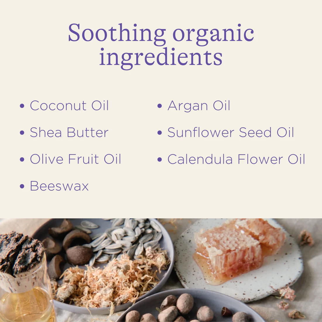 – Cire d’abeille Bio : peut aider à apaiser la peau sensible et sèche.
