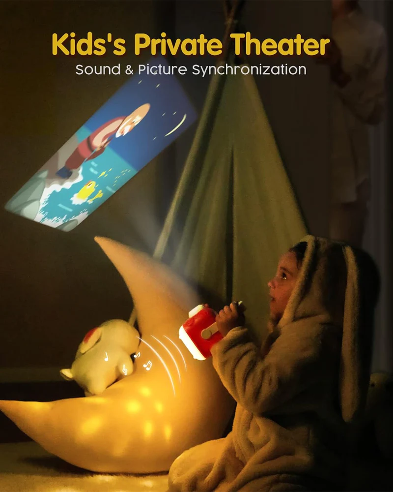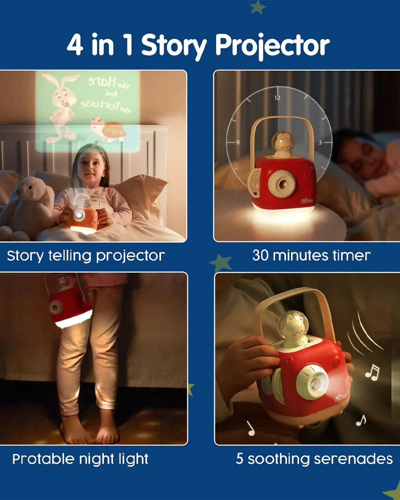 Le ZzzMoon est bien plus qu’un projecteur : il combine contes, veilleuse étoilée, berceuses et sons apaisants de la nature pour créer une atmosphère relaxante. Avec son zoom réglable et ses diapositives synchronisées, il projette des images nettes et captivantes sur le mur ou le plafond. Chaque figurine incluse raconte 8 histoires populaires, en français ou en anglais, adaptées aux jeunes esprits curieux.