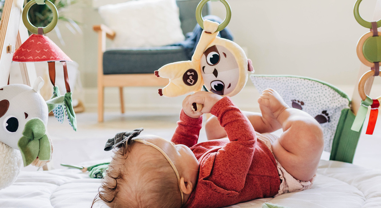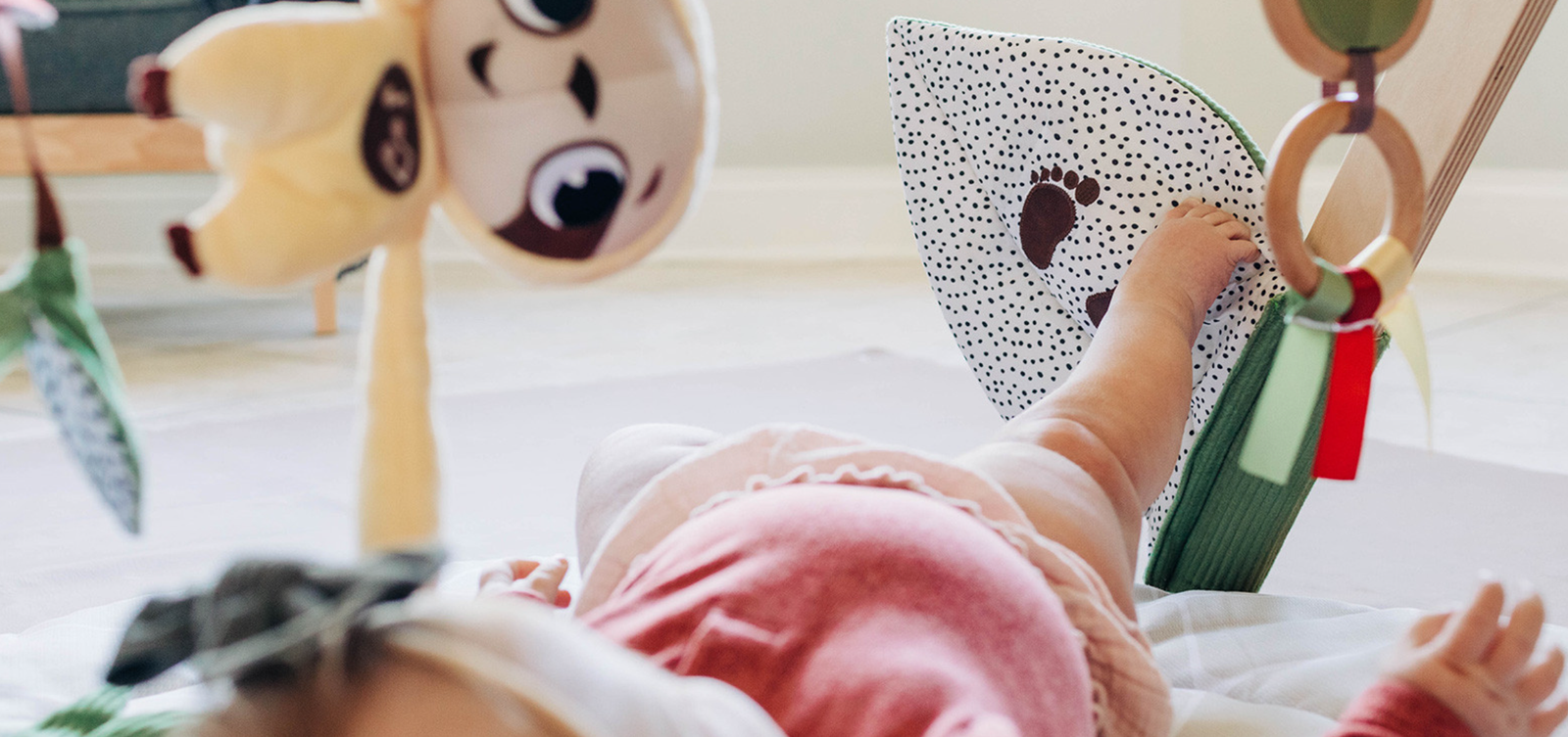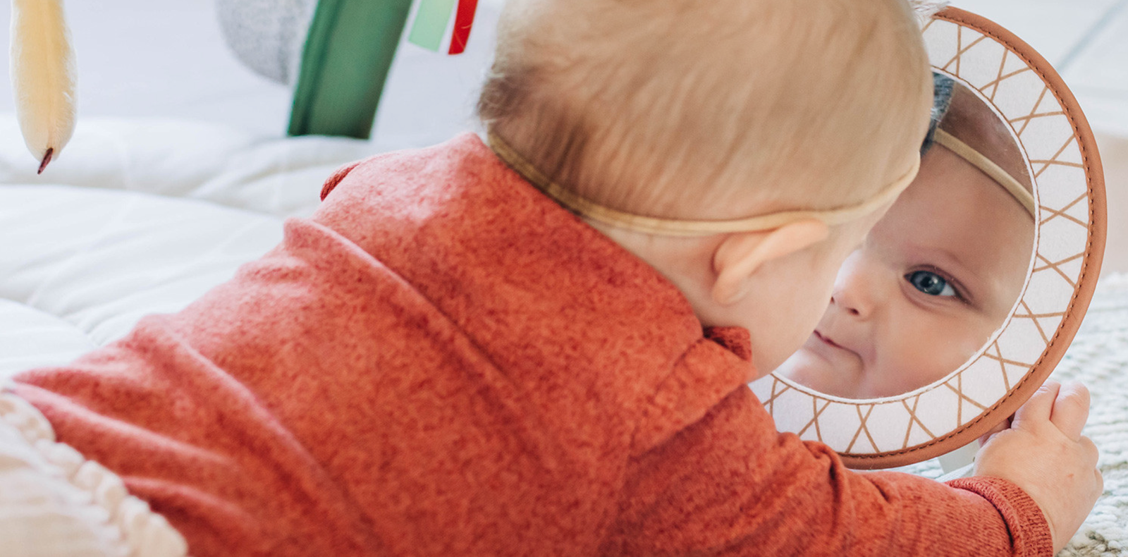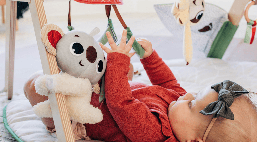 - Plante en tissu bruissante, miroir attrape-rêves, anneaux de préhension, et autres jouets interactifs.