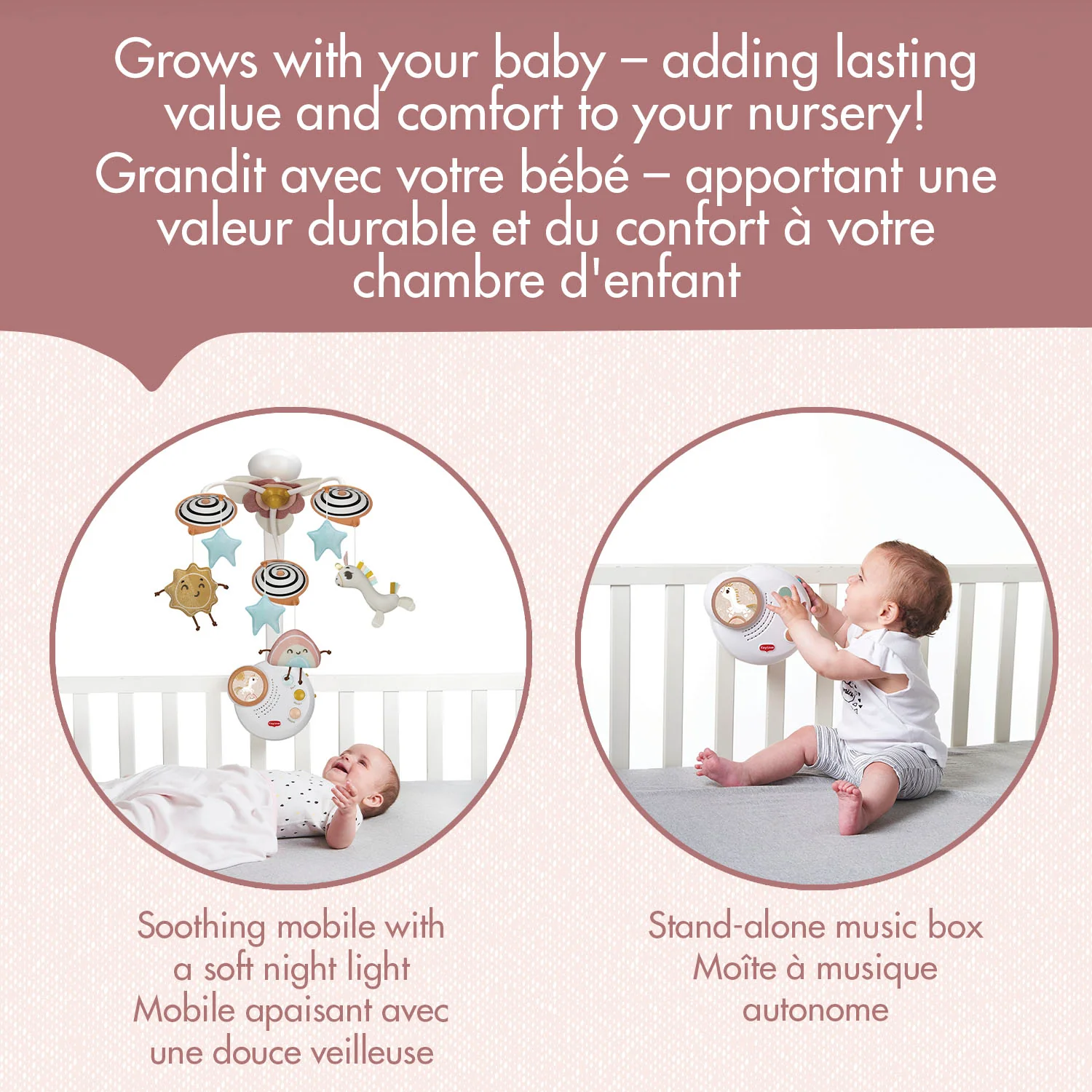 Se transforme de mobile apaisant avec une douce veilleuse en boîte à musique autonome, offrant un confort durable.