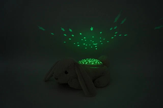 Twilight Buddies™ – La peluche veilleuse Lapin apaisera votre enfant au moment du coucher. Elle transforme une pièce sombre en un ciel étoilé en projetant la lune et 3 vraies constellations sur les murs et le plafond de la chambre, avec projection alternée en 3 couleurs apaisantes : vert, bleu et ambre